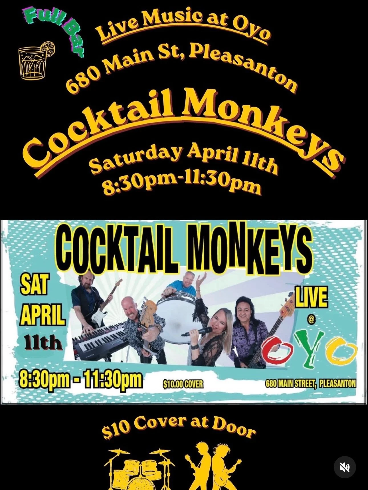 Back to All Events Cocktail Monkeys Playing live at Oyo Saturday, April 11, 2026 8:30 PM 11:30 PM Google Calendar ICS